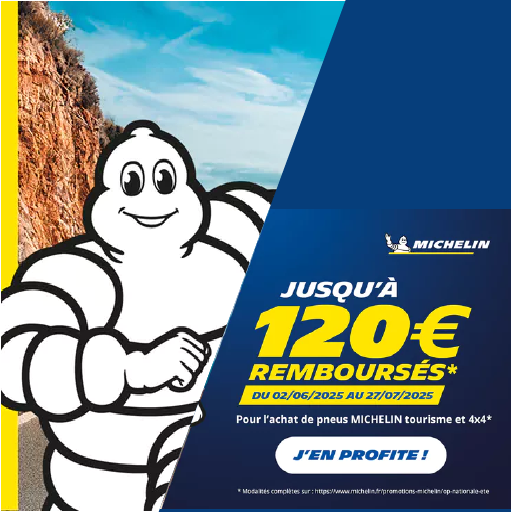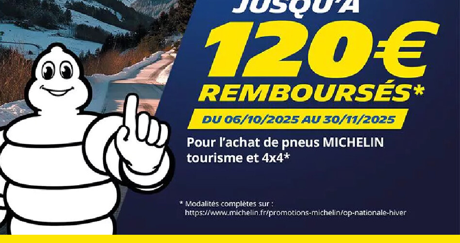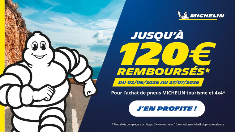 Jusqu’à 120€ remboursés pour l’achat de pneumatiques de la marque MICHELIN dans les catégories Tourisme et 4×4 (été, hiver ou CrossClimate), à l’exclusion des gammes camionnette « MICHELIN Agilis » et camping-car « MICHELIN CrossClimate Camping».
